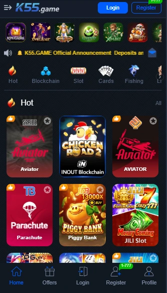 k55 Game offers many new and exciting games, including Money Coming, Dragon vs Tiger, Crush, Plinko, Fishing and Jili games, along with other fun options. By playing these games, users can earn unlimited virtual coins and enjoy a great gaming experience.